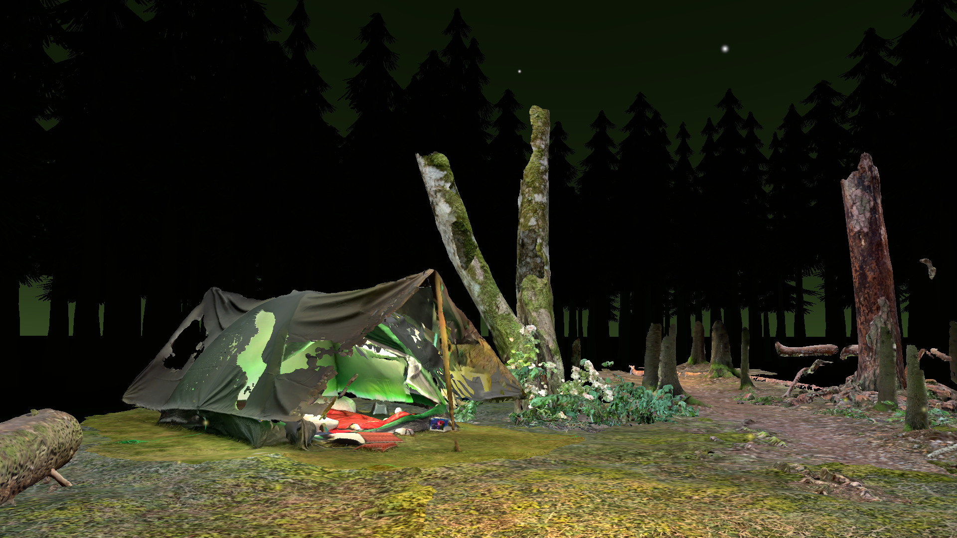 A digital exhibition built from 3D scans of Latvian nature, captured using LiDAR technology. The experience features Daudas waterfall, a summer camping tent, and a walking corgi. The environment is layered with a forest backdrop, firefly particle effects, and spatial 3D audio to create atmosphere. Visitors can traverse the extended dune trail—an experiment in the limits of continuous scanning—and encounter the artist at the digital trail's end.